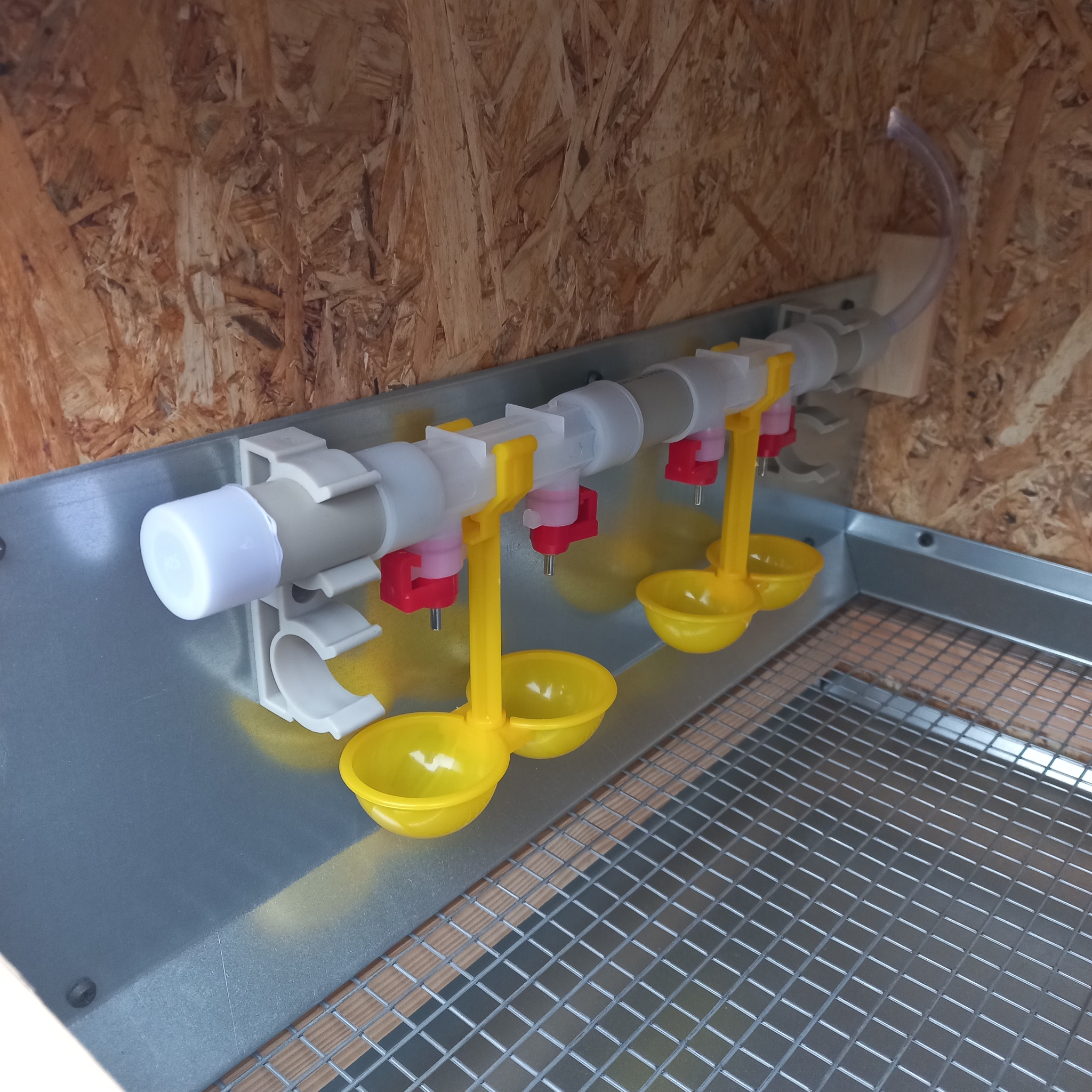 - Ниппельное поение: регулируемое по высоте, с ёмкостью для воды.