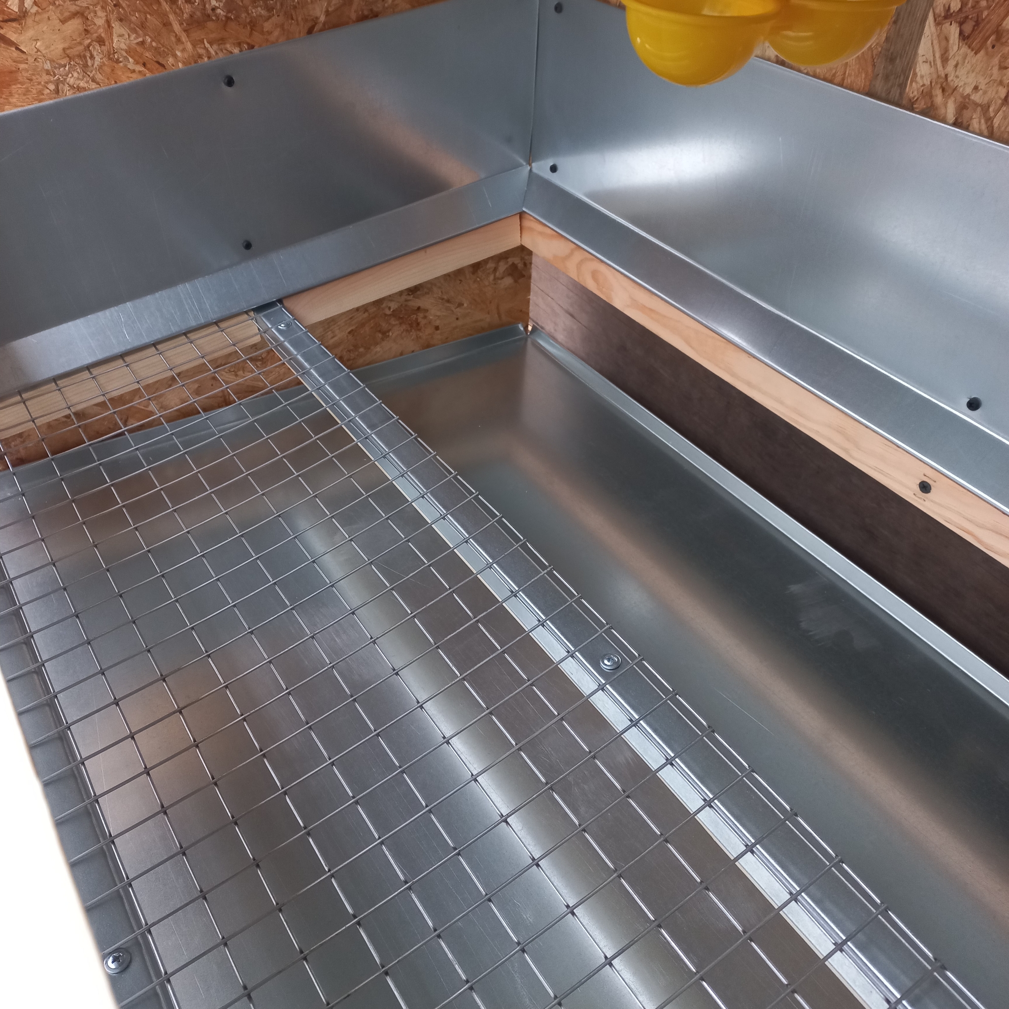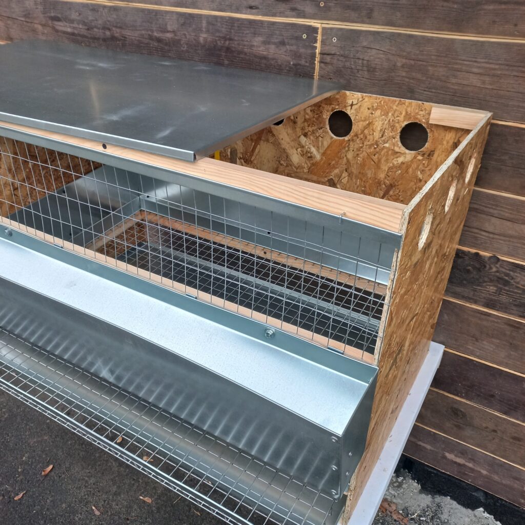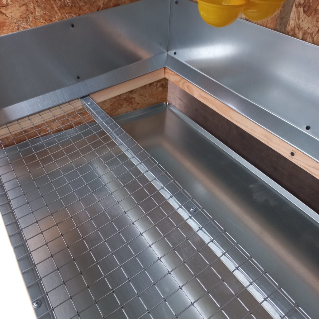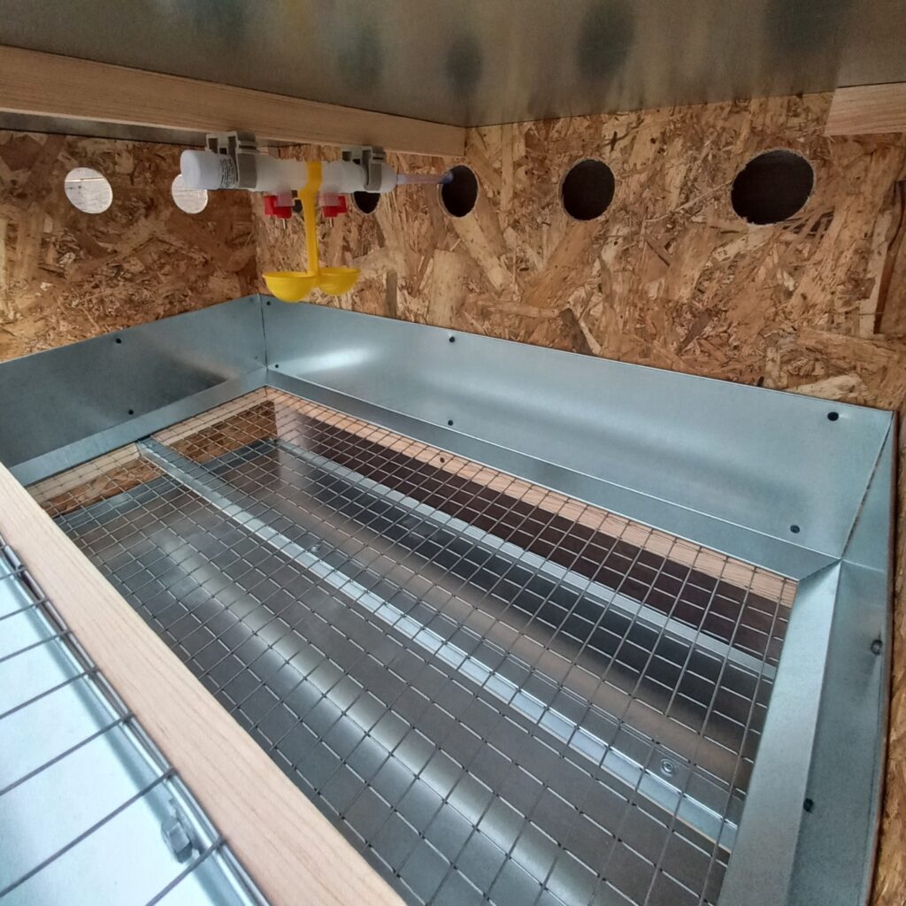 – Нижняя часть состоит из пола из оцинкованной сетки 25×25 мм с яйцеприёмником и увеличенным поддоном из оцинкованной стали. - Особенности конструкции: